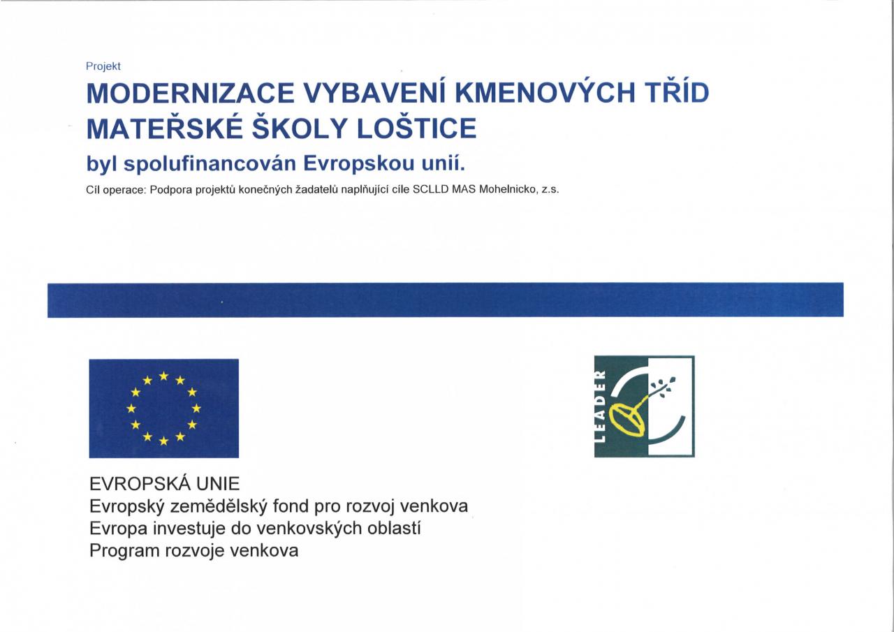 Do žádosti o dotaci byl uplatněn projekt v rozsahu vybavení dvou kmenových tříd mateřské školy nábytkem a nutná obnova stolků a židliček ve všech čtyřech kmenových třídách. Součástí modernizace herních prostor je i nutná výměna parapetů a rekonstrukce ochranných krytů na radiátory, tak, aby herní prostory splňovaly požadavky na bezpečnost a ochranu zdraví dětí. Dne 8. 11. 2021 byla žádost o dotaci na projekt „Modernizace vybavení kmenových tříd Mateřské školy Loštice“ schválena Státním zemědělským intervenčním fondem ke spolufinancování z Programu obnovy venkova. Celkové náklady projektu činí 747.331,00 Kč, celková výše dotace poskytnutá Státním zemědělským intervenčním fondem ČR na projekt činí 597.864,80 Kč, spoluúčast města na financování projektu je 149.466,20 Kč.
