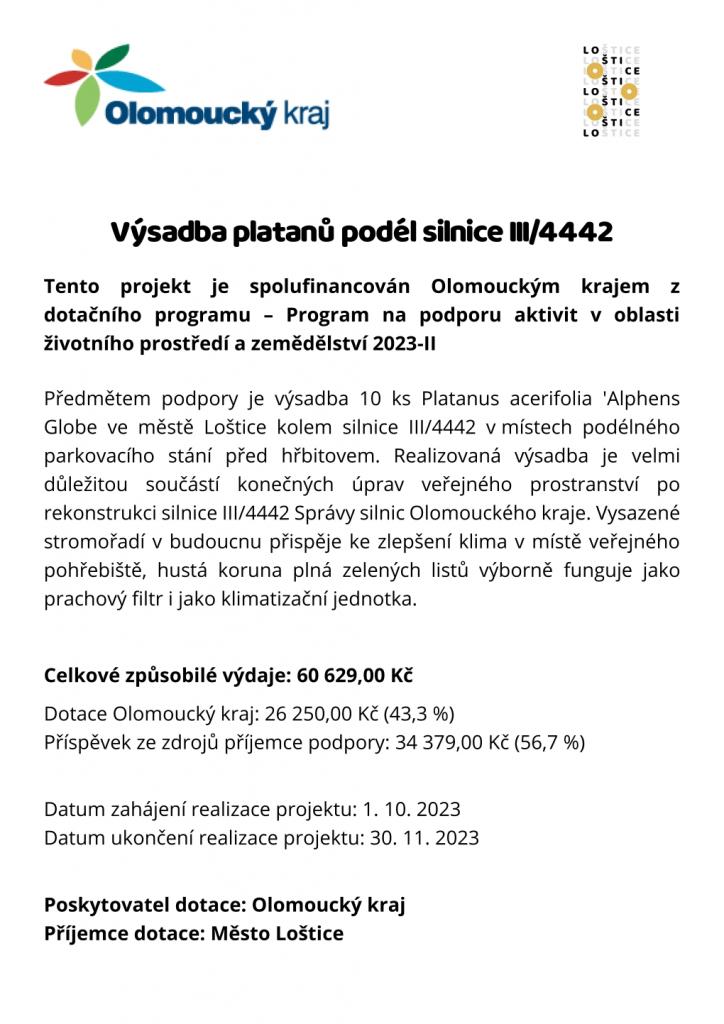 Předmětem podpory je výsadba 10 ks Platanus acerifolia 'Alphens Globe ve městě Loštice, kolem silnice III/4442, v místech podélného parkovacího stání před hřbitovem. Realizovaná výsadba je velmi důležitou součástí konečných úprav veřejného prostranství po rekonstrukci silnice III/4442 Správy silnic Olomouckého kraje. Vysazené stromořadí v budoucnu přispěje ke zlepšení klimatu v místě veřejného pohřebiště, hustá koruna plná zelených listů výborně funguje jako prachový filtr i jako klimatizační jednotka.