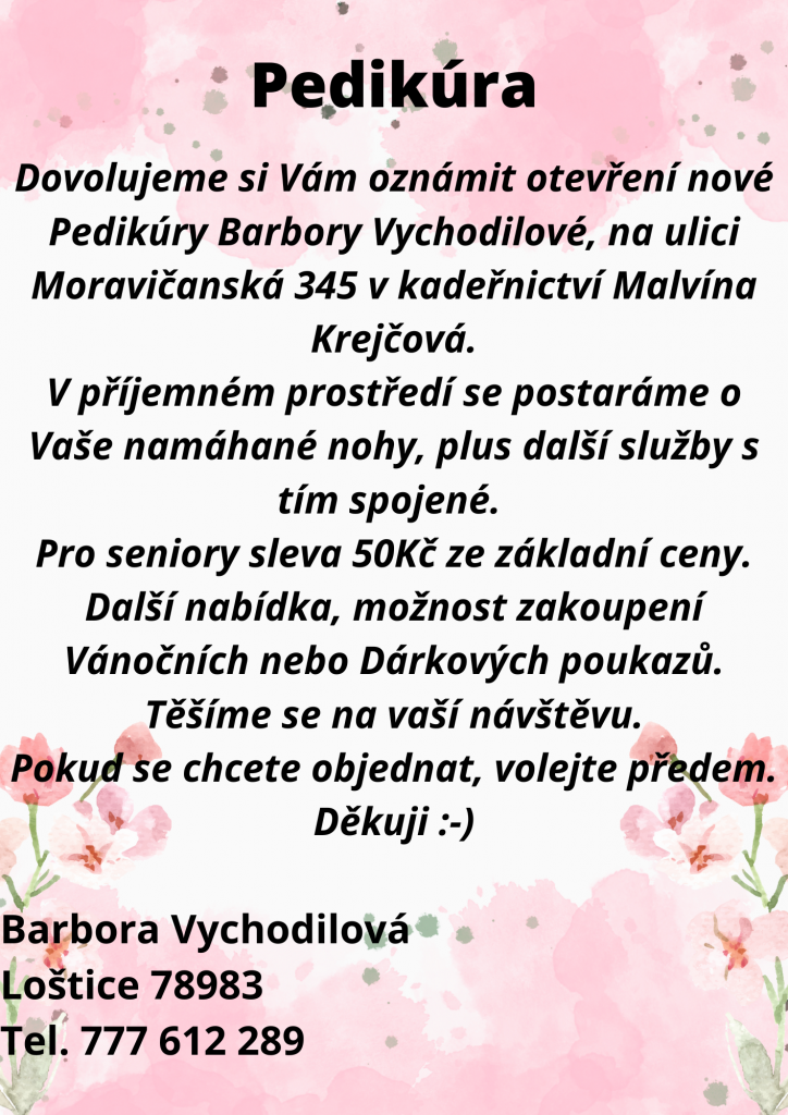 Oznamujeme otevření nové Pedikúry Barbory Vychodilové na ulici Moravičanská 345, Loštice v kadeřnictví Malvína Krejčová. Mobilní telefonní číslo pro objednávky: 777 612 289