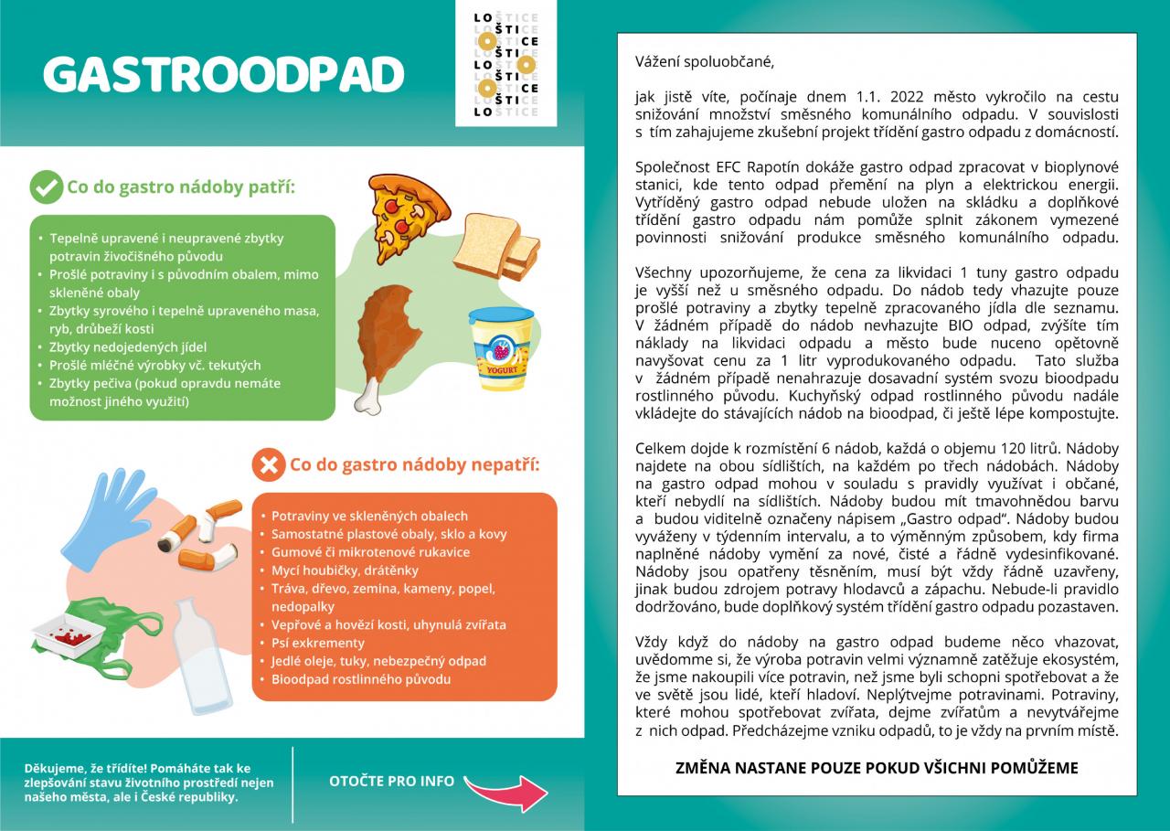 Město Loštice, počínaje dnem 1. 1. 2022, vykročilo na cestu snižování množství směsného komunálního odpadu. V souvislosti s tím město zahajuje zkušební projekt třídění gastro odpadu z domácností.