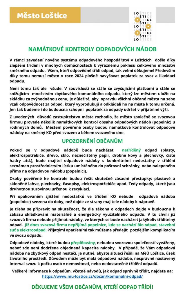 Má obec právo kontroly obsahu odpadových nádob u rodinných domů před převzetím odpadu svozovou firmu? A v případě, že obsah nádoby na směsný odpad neodpovídá zákonu o odpadech a vyhlášce města, která stanoví, že původce odpadu musí mít odpad řádně roztříděn má obec právo odmítnout tento odpad převzít?