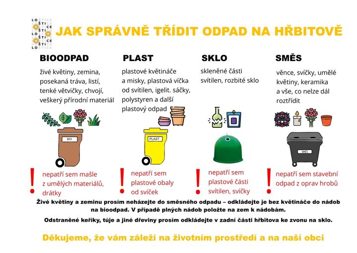 Rádi bychom důrazně upozornili, že okrasné kamínky a další materiály používané při úpravách hrobových míst spadají do kategorie stavebního odpadu. Tento druh odpadu není možné ukládat ani do bioodpadových nádob, ani do kontejnerů na směsný komunální odpad.