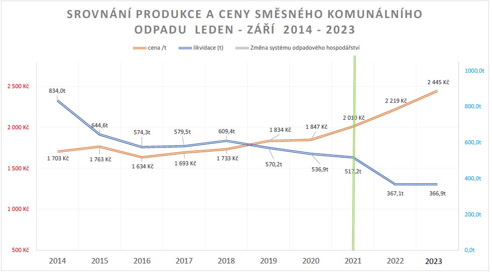 SROVNÁNÍ PRODUKCE A CENY SMĚSNÉHO KOMUNÁLNÍHO ODPADU LEDEN - ZÁŘÍ 2014 - 2023