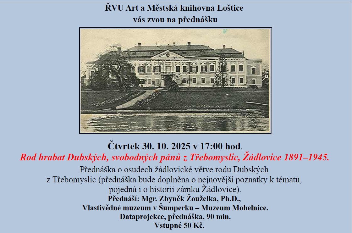 Městská knihovna Loštice a ŘVU Art vás zvou na přednášku o osudech rodu Dubských, svobodných pánů z Třebomyslic. Akce se koná 30. října 2025 od 17:00 hod. v prostorách knihovny.
