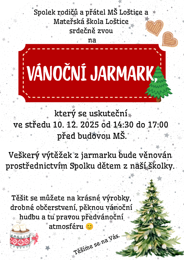 Mateřská škola Loštice srdečně zve na Vánoční jarmark, který se uskuteční 10. 12. 2025 před budovou MŠ. Veškerý výtěžek z jarmarku bude věnován prostřednictvím Spolku dětem z naší školky.